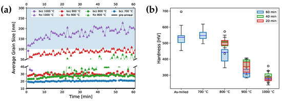 Figure 4b shows hardness measurements for all anneal conditions after 60 min holds. Furthermore, hardness for the 800, 900 and 1000 C after 20 and 40 min holds are shown. For comparison, hardness values for the as-milled powders are shown as well. For 700 C, hardness values were only after a 60 min anneal because the XRD analysis did not show any significant microstructural changes as a function of anneal time. While the grain size is slightly larger after a 700 C anneal than the as-milled powder (see Equations (2) and (4)), a small increase in average hardness is observed. This increase is likely due to dissolution of the Zr remaining in solution from the as-milled condition, resulting in the nucleation of more Zr-oxide precipitates. For the 800 C anneal, the hardness values for 20 and 40 min anneals overlap, while a substantial drop is noticed for the 60 min hold. This is likely due to grain boundaries becoming unpinned by the oxide precipitates, leading to grain growth and reducing the Hall–Petch effect. Lastly, the 900 and 1000 C anneals show a large drop in hardness when compared to the as-milled powder. The 900 C anneal shows a gradual decrease in hardness with increase in hold time. However, hardness values are statistically undistinguishable at the three holds. For the 1000 C anneal, the hardness decreases to approximately HV after 20 min, and remains statistically unchanged for the other hold times. This correlates to the measured XRD which showed that the alloy fully undergoes the transformation after min.