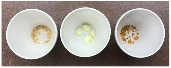 Figure 1. PGE salts from left (Pd, Pt, and Rh) produced by reacting PGE metal powder with potassium bisulfate in a muffle furnace at 550 °C for 3 h.