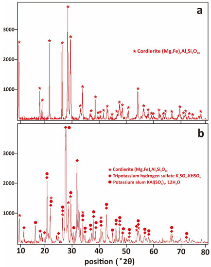 Figure 2. X-Ray powder diffraction of raw materials (a) before and (b) after fusion with potassium bisulfate.