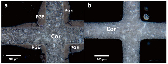 Figure 3. Metallographic observation on catalytic converters mounted on resin (a) before and (b) after fusion using potassium bisulfate, followed by leaching using hydrochloric acid 5 M. (Cor: cordierite matrix; PGE: platinum group element coating).