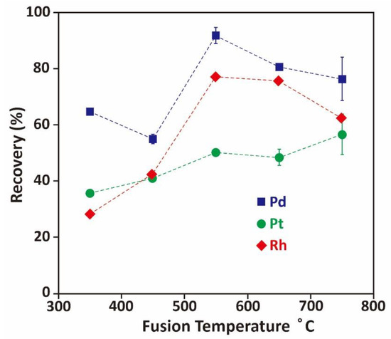 The effect of fusion temperature was studied between 350 and 750 °C, with a constant fusion variable: mass ratio (KHSO4/catalytic converters powder) 2 and fusion duration 3 h. The results were depicted in Figure 4, which showed that the recovery of PGE increased as temperature increased, until it reached the optimum fusion temperature at 550 °C (recovery Pd 92%, Pt 50%, and Rh 78%), and, then, decreased (Pd and Rh) or became relatively constant (Pt). The increasing recovery up to 550 °C, then decreasing recovery, indicates the advantage of thermal decomposition of KHSO4 into K2S2O7, which oxidized the PGE present in the raw material. A higher fusion temperature caused further decomposition of potassium pyrosulfate into potassium sulfate (T > 600 °C) [30], which has less oxidative power than pyrosulfate. The XRD data confirmed the transformation of potassium bisulfate into potassium pyrosulfate during fusion up to 650 °C and partial transformation into potassium sulfate at higher temperatures, (Supplementary Materials).