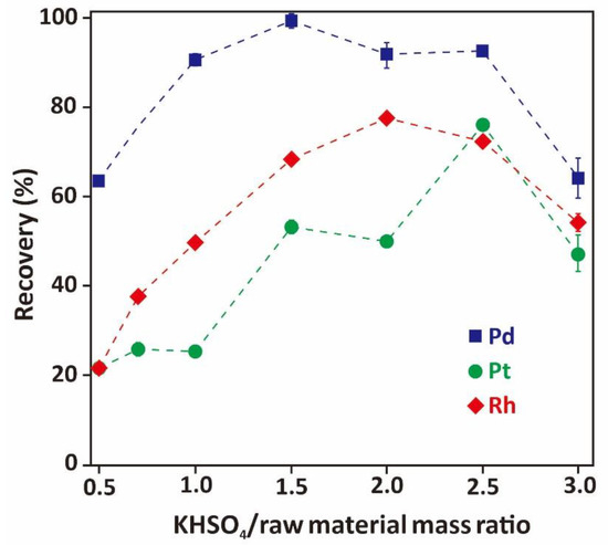 To assess the effect of the amount of fusion agent (KHSO4) added relative to raw materials on the PGE recovery, the fusion was carried out with varied KHSO4/catalytic converters mass ratios from 0.5 to 3. The constant fusion variables were temperature (550 °C) and fusion duration (3 h). The results are depicted in Figure 5. The figure shows the recovery increased as mass ratio increased until an optimum value of 2–2.5 (Pd 93%, Pt 76.5%, and Rh 77.6%), then the recovery decreased as mass ratio increased further. The decreasing recovery at higher mass ratio was probably caused by precipitation of PGE in the form of potassium salt of chloro-complexes (e.g., K2PtCl6 [31]) during leaching, due to an excess of potassium ion introduced during the fusion at higher mass ratios (reactions 6–7).