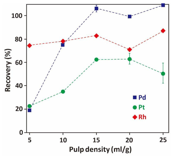 Figure 7. The effect of leaching parameter pulp density on PGE recovery.