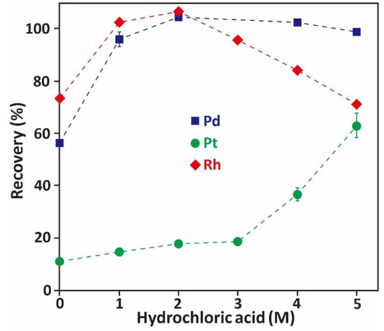 To study the effect of hydrochloric acid as a lixiviant, the leaching temperature, leaching time, and pulp density were fixed constant at 30 °C, 6 h, and 20 mL/g, respectively. Hydrochloric acid concentration as an independent variable was set from 0 to 5 M. The results depicted in Figure 8 show the recovery of Pd and Rh at control conditions (HCl concentration 0/leaching with deionized water) were quite significant (Pd 56.4% and Rh 73.6%), while Pt recovery was only 12%. These results also confirmed the efficacy of potassium bisulfate as the sole fusing agent to transform PGE into a soluble PGE compound. In general, excluding Rh, the PGE recovery increased as the hydrochloric acid concentration increased; this was caused by the stabilization of PGE as chloride complexes in pregnant leach solution. The Rh recovery showed a different trend; the recovery decreased as the hydrochloric acid concentration increased. This was possibly due to the formation of a less soluble Rh chloride complex (K2RhCl5) in a higher chloride concentration compared to Rh sulfate [32], Reaction (8). In the case of Pd, the increasing recovery at the higher hydrochloric acid concentration was due to the stabilization of Pd as a chloride complex.