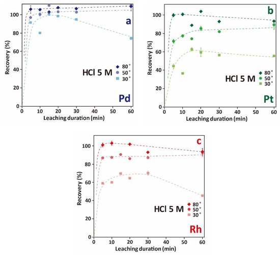 Figure 10 also shows that the saturation value of recovery increased, as a result of increasing the leaching temperature. In the case of Pt, the leaching efficiency reached 99.9% ± 2.8% within 5 min at 80 °C, while, for Rh, the recovery increased from 87.2% ± 1.4% (50 °C) to 101.4% ± 6.8% (80 °C). For Pd, the effect of increasing temperature was less significant than it was for Pt and Rh.