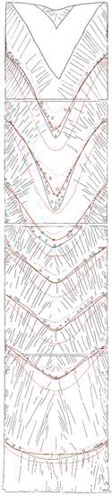 For instance, Weber et al. [] compared the liquid pool profiles simulated using their comprehensive 2D axisymmetric model to those obtained from an industrial Ni-based alloy remelted ingot. Two main stages composed this experiment: the first half of the electrode was remelted using a low melt rate and a low current, and then a higher melt rate was achieved using a higher electric current. Operating conditions are given more in details in the original publication.