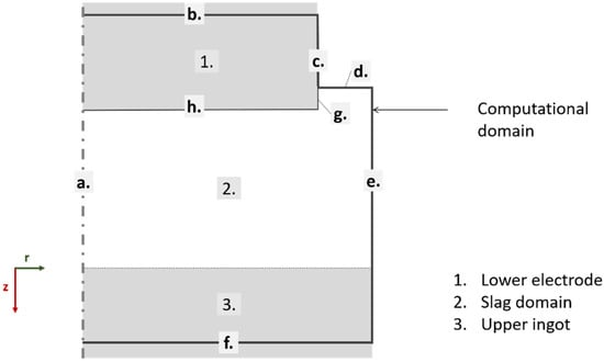 The computational domain is schematically shown in Figure 4, while the process dimensions and operating conditions for the industrial-sized reference case studied are given in Table 1. The domain covers the whole slag bath and includes the lower part of the electrode and the upper part of the ingot. The immersed tip is considered flat and does not suffer any morphology change during the simulation. Solidification of the ingot is not considered.