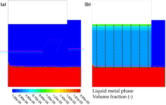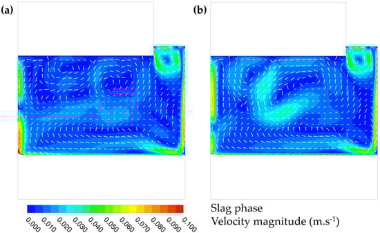 As reported by various studies using monophasic models [,,], slag motion is driven by the combination of Lorentz forces and buoyancy. The thermal buoyant circulation is caused by the lateral cooling, and is seen as a clockwise motion on Figure 6a. The Lorentz forces, generated as the electric current flows through the slag, create a vortex under the electrode, and are visible as a counter-clockwise loop in Figure 6.