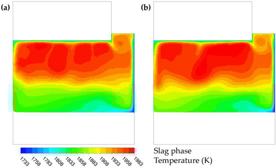 Temperature distribution of the slag phase (time-averaged) for the case without drops (a) and considering the drops fall (b).
