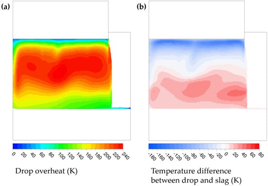 It is interesting to look at the temperature difference between slag and drop and the drop overheat fields, as shown in Figure 8. Drop overheat is defined by T − Tliquidus. The drops are first heated by the slag when they fall through the hotter region, and then are cooled as they reached the cooler bottom part of the slag cap. Finally, they are overheated by around 100 to 120 K when they enter the melt pool. One can also notice that drops of 5 mm and larger diameter are not in thermal equilibrium with the slag, as illustrated in Figure 8b. This represents a fairly new finding, as thermal equilibrium has been generally assumed throughout the literature.