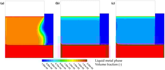 Liquid metal volume fraction (time-averaged) considering the fall of 1 mm (a), 5 mm (b) and 10 mm (c) liquid metal drops.