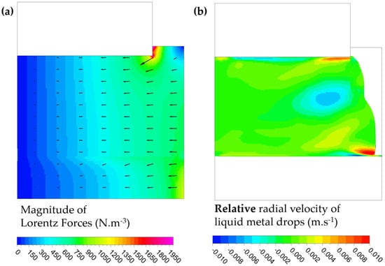 In opposite, in the case of smaller drops—here 1 mm diameter (Figure 11a)—the slag hydrodynamics is greatly modified. The flow loop governed by electromagnetic forces seems to be predominant. The electrical conductivity of the mixture is around 251 Ω−1·m−1, so electromagnetic field is mostly the same as for other cases. As shown by Figure 12, Lorentz forces calculated for the case with 1 mm droplets are sensibly similar than in the single phase case. A small increase around 0.5% is predicted in the region where the electro-vortex intensifies. Nevertheless, as electromagnetokinetic effect is introduced is the model (factor 3/2 on the drop’s Lorentz force), these droplets get higher momentum in the radial direction. This additional momentum is then transferred to the slag by a mechanism of drag interaction. The electro-vortex is then strengthened by the presence of small droplets, not because of a change in the electromagnetic field (almost the same), but only because of hydrodynamic interactions.
