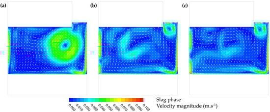 Considering large drops (5 and 10 mm diameter, Figure 11b,c), slag hydrodynamics is quite similar to the case where the drop fall is not considered (Figure 6a). As the metal volume fraction is small and homogeneously distributed, these big drops does not have a strong influence on slag motion.
