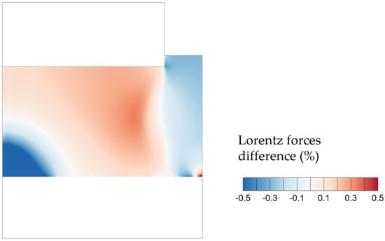 Difference of Lorentz forces (in %) between the case with 1 mm droplets and without droplets.