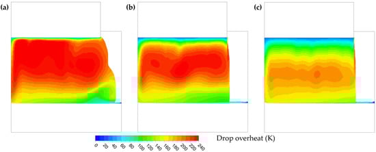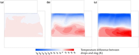 The size of the drops also affects the heat exchange: small droplets are almost in thermal equilibrium with the slag, while larger ones are not, as illustrated in Figure 13. Slag temperature distribution is similar in these three cases, so the maximum overheat is reached for the smallest droplets. However, during their fall in the bottom part of the slag cap—which is cooler—these small droplets also lose more quickly their overheat, while bigger drops remain hotter than the surrounding slag. Hence, 10 mm drops bring more enthalpy to the melt pool than 1 mm drops. Drop overheats are compared in Figure 14.