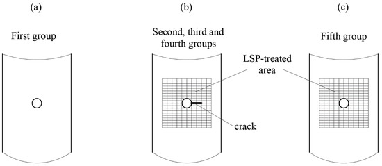 (a) Illustration of the base material specimens, including a fastener hole; (b) Illustration of the specimens from the 2nd, 3rd, and 4th groups, including a fastener hole and an initial crack, which are subsequently treated by LSP; (c) Illustration of the specimens from the 5th group, where the specimens are first treated by LSP before a fastener hole is introduced.