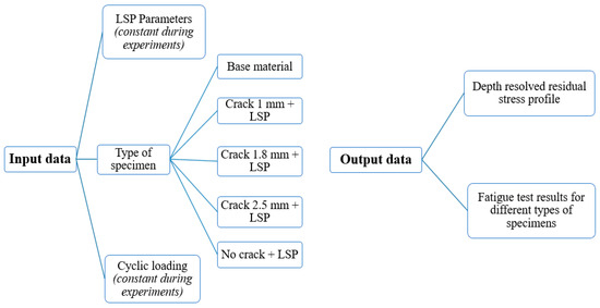 The specimens of the fifth group were manufactured without a central hole. They are intended to study the effect of LSP on the specimens with a fastener hole in as-manufactured condition without an initial fatigue crack. According to the study of Ivetic et al. [9], it is advantageous when LSP is applied before drilling a hole. Therefore, firstly the specimens were treated by LSP, and subsequently holes were introduced in the specimens. The specifications of the used specimens are given in Table 1 and illustrated in Figure 2. Figure 3 presents the block scheme of the experimental program.
