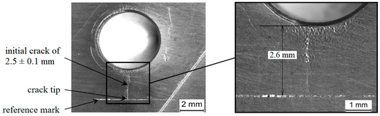 To create the initial fatigue cracks in the specimens of groups 2, 3, and 4, the specimens were subjected to a pre-fatigue test. The used resonant testing machine allows to monitor resonant frequency during the fatigue test. The resonant frequency versus number of loading cycles record was used to identify the number of cycles required for crack initiation and crack propagation. Lorenzino and Navarro [20] reported that an initial growth of the resonant frequency can be attributed to the effect of cyclic hardening in the material, while a drop in the frequency is associated with a crack growth. Similar observations were also reported in [14]. To monitor the fatigue crack growth, a visual inspection was carried out using an optical microscope on both specimen surfaces. On the front and back surfaces of each specimen, reference marks were preliminarily applied to indicate the targeted length of the initial fatigue crack. As soon as the fatigue crack reached the reference mark, the fatigue test was stopped. By this method, specimens with initial fatigue cracks of 1.0 ± 0.1 mm, 1.8 ± 0.1 mm, and 2.5 ± 0.1 mm length were created. Figure 4 presents one specimen with a created initial fatigue crack of 2.5 ± 0.1 mm length.
