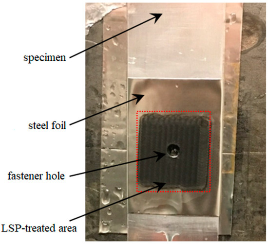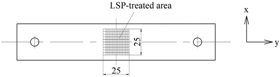The main goal of applying LSP is to introduce deep compressive residual stresses into the material up to several millimeter depth [21]. Appropriate LSP parameters were identified according to the study by Chupakhin et al. [12], in which the same material and specimen thickness were used. In the current study, the Q-switched Nd:YAG laser operating at 10 Hz was used. The wavelength was 1064 nm and the pulse duration was 20 ns (full width at half maximum, FWHM). A diffractive optical element was used to deliver 5 J to a square spot of 2.5 mm × 2.5 mm on the specimen surface. The overlap rate of the adjacent spots in the vertical direction was 50%; in horizontal direction, the overlap was not used. The treated area was 25 mm × 25 mm. The size of the LSP-treated area was chosen to cover completely the initial fatigue cracks and additionally based on the paper of Achintha et al. [10]. The authors showed that applying LSP across the entire width of a specimen is unreasonable in terms of fatigue life prolongation, because in that case, tensile residual stresses occur in the mid-plane of the specimen, and the hole would be affected by these stresses. On the other hand, if LSP is applied only around the hole, the residual tensile stresses occur near the edge of the specimen, and it becomes possible to place the entire hole into residual compression. The specimens were covered for LSP by a stainless steel foil with the thickness of 0.1 mm. The material surface was covered by a laminar water layer with a thickness between 2 and 3 mm. The specimens were LSP-treated on both sides. A photograph of the specimen after the LSP treatment is presented in Figure 5.