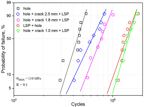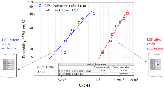 After establishing that LSP mainly affects the fatigue crack growth period, the fatigue growth was investigated further in two different scenarios. In the first case, the crack nucleated before applying LSP, corresponding to the 2nd, 3rd, and 4th groups. For this analysis, only the second group (hole + crack 1 mm + LSP) is analyzed. In the second case, the crack nucleated after applying LSP; this case corresponds to the fifth group (LSP + hole). To allow a direct comparison, the crack growth kinematics of 1.0-mm long cracks have been studied depending on the LSP treatment application: prior to the crack initiation (LSP as prevention) or after the crack initiation (repair). To compare these scenarios, the number of cycles until final failure was determined. A Weibull plot was used to display the results; see Figure 11. The results show that the number of cycles required to grow from a 1.0 mm crack until final failure in specimens treated by LSP after crack nucleation is significantly higher than in specimens treated by LSP before fatigue crack nucleation. Therefore, it can be concluded that the crack nucleated in the field of residual stresses grows faster than the crack nucleated without prior residual stresses. This leads to the conclusion that the LSP technology has the biggest potential to be applied as a repair technique, i.e., by introducing residual stress fields in the localized area around a fatigue crack detected during maintenance. This can increase the inspection intervals significantly, thus reducing the risk of failure and maintenance costs.
