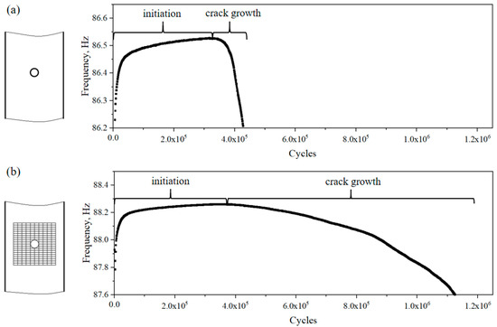 - Lorenzino, P.; Navarro, A. The variation of resonance frequency in fatigue tests as a tool for in-situ identification of crack initiation and propagation, and for the determination of cracked area. Int. J. Fatigue 2015, 70, 374–382. [Google Scholar] [CrossRef]