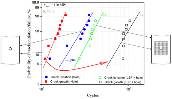 Effect of LSP on the crack initiation and crack growth periods of the fatigue life. The blue line corresponds to the number of cycles for the crack nucleation in the specimens without LSP, the red line corresponds to the number of cycles for the crack growth (from nucleation until failure) in the specimens without LSP, the green line corresponds to the number of cycles for the crack nucleation in the specimens with LSP, and the black line corresponds to the number of cycles for the crack growth in the specimens with LSP. The blue arrow represents the positive effect of LSP on the fatigue behavior of the specimens regarding the fatigue crack initiation, and the red arrow represents the positive effect of LSP on the fatigue behavior of the specimens regarding the fatigue crack growth.