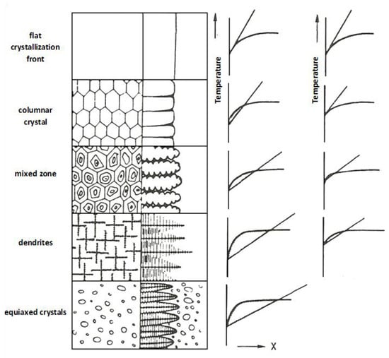 The first descriptions of the macrosegregation effect concentrated on the analysis of effects occurring during the metal solidification process at the interface. Assuming that the solubility of the segregating element was known, both in the liquid phase and the solid phase, the metal bath liquidus temperature variability profile was determined by the intensity of the liquid phase stirring near the interface. The determination of the variability of the actual melt temperature and the corresponding liquidus temperature at a specific point allowed us to determine the undercooling caused by the segregating element’s concentration gradient. The intensity of the constitutional undercooling occurrence was associated directly with the structure of the forming cast strand [], presented in Figure 1. Every single case of the liquidus temperature profile and the actual bath temperature, near the crystallization front, was correlated with the observed structure. The temperature profiles were introduced for both the beginning and the end of a given crystallization step. It can be seen that the type of crystalline structure strongly depends on the initial value of the constitutional undercooling.
