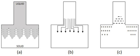 Applying the presented concept to a quantitative description of the macrosegregation effect would not allow for the many complex effects occurring within the solidification zone. Fleming [,] presented one of the more interesting analyses of the problem. He aimed to challenge the possibility of macrosegregation occurrence as the result of simply pushing the segregated addition out into the liquid phase, with high concentration gradients of the addition being pushed out before the crystallisation front. Fleming recognised the interdendritic flow varying in time as the basic mechanism of macrosegregation occurrence. Referring to a conducted experiment [], he presented the macrosegregation as a result of the solidification process with a decreasing cross-section area of the flow (Figure 2). The mathematical model developed on the basis of this theory, taking into account the shrinkage effect and the deformation of the liquid phase space is based on the following relationship []: