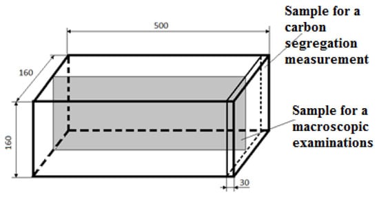Derived weight values and the justification of the selection will be presented in the next step with the definition of Equation (7). The starting point for the balance analysis conducted is the assumption that the balance of any segregating element does not change. It means that its content in the sample after segregation is exactly the same as in the hypothetical condition without any segregation. Let us consider, for instance, a test sample, which is a rectangular prism with dimensions 160 mm × 160 mm × h mm, where h is its height. Assuming that no concentration gradient occurs, the mass of carbon m[C] contained in this sample should be determined from the equation: