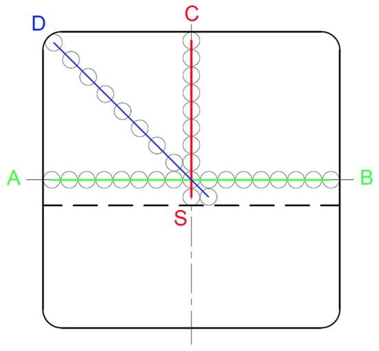 The test results obtained in ArcelorMittal Poland (the Dąbrowa Górnicza Branch) for billets made in a six-strand caster, with strand dimensions 160 mm × 160 mm, confirm that the considerations, presented above, are right. During comprehensive tests of the carbon segregation effect, samples were taken from billets number 5, 10, and 15 (beginning, middle, and the end of the 300 t heat) from strands number 1 and 3. The sample number directly indicates a strand and the billet number in relation to the heat; for example, sample no. 1/5 was taken from the first strand and the fifth billet. The sampling method is presented in Figure 3. 30 mm thick “slices” were cut out from all cast strand samples taken, and the carbon content was measured at points presented in Figure 4.