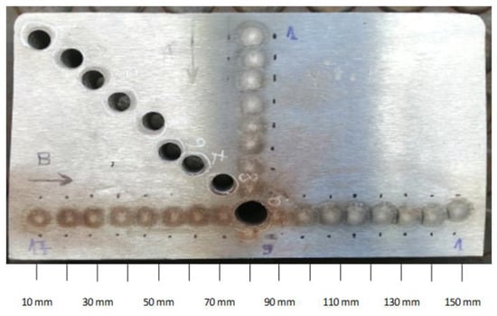 Additionally, for random samples at points on the DS line (a diagonal of the square 160 mm × 160 mm—marked in the Figure 4), first spark spectrometry was performed, followed by drilling at these points to take material for the second analysis with a LECO analyser. The picture shown in Figure 5 presents the condition of a sample after drilling. The overall results for all measurement points obtained with both methods are summarised in Table 1 and Table 2. Heat number 1 was cast with the lower casting speed (1.8 m/min), and heat number 2 was cast with the higher casting speed (2.5 m/min).