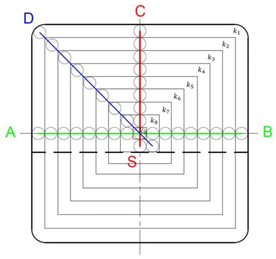 where Fi is the area of the “i-th” zone, h is the sample height, ρ is the steel density, [C]0 is the carbon percentage in the sample if there were no segregation, ki is the carbon segregation ratio in the “i-th” zone (equal to [Ci]/[C0], [−]), [C]i is the carbon percentage measured in the “i-th” zone. As the calculated carbon contents in Equations (6) and (7) must be identical, it results in this relationship: