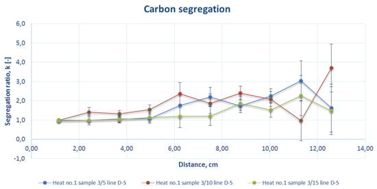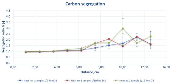 To evaluate the influence of casting speed on the segregation intensity, the DS measurement line (Figure 4) was assumed, where, in most cases, fairly stable changes of the k-ratio were observed. In this case, the difference between the maximum values of segregation ratios for samples taken from strand number 1 and strand number 3 is relatively low. When determining the average for the maximum values of the obtained segregation ratios, we found that for a heat cast with a speed of 2.5 m/min, the value of the k-ratio increased by about 13%, compared to the casting speed of 1.8 min. The graphs in Figure 7, Figure 8, Figure 9 and Figure 10 allow the stability of segregation effect to be estimated for the selected measurement DS line, in comparison to relevant values of the k-ratio for billets number 5, 10, and 15.