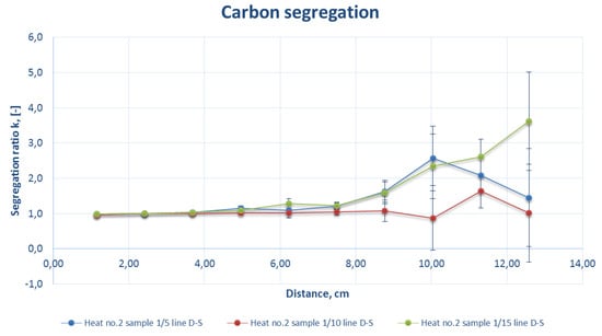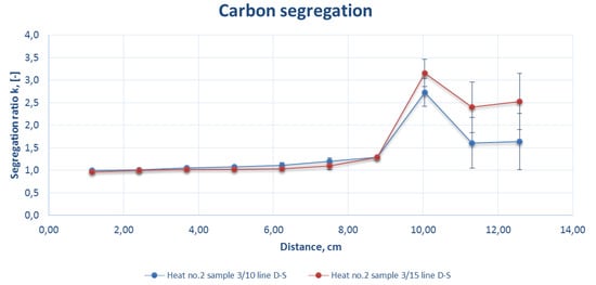 where [C] is the carbon percentage at point “i” of the sample and [C]ladle is the carbon percentage in a ladle sample. Both the numerator and the denominator of this fraction influence the accuracy of the estimation of the value of the segregation ratio. It is observable that the accuracy of the ladle sample analysis is particularly relevant as its potential error is transferred onto all values of the k-ratio. In addition, a principal approach to the segregation effect requires that the stability of the melt chemical composition be considered. In the continuous steel casting process, at each replacement of the main ladle, there is a transition period, during which the chemical composition changes. Additionally, small composition gradients within the heat cannot be excluded, because of the imperfect homogenization of the melt, in particular at the beginning of casting the subsequent heat in a sequence. Determining the denominator in Equation (4) can be another method used to solve the problem.