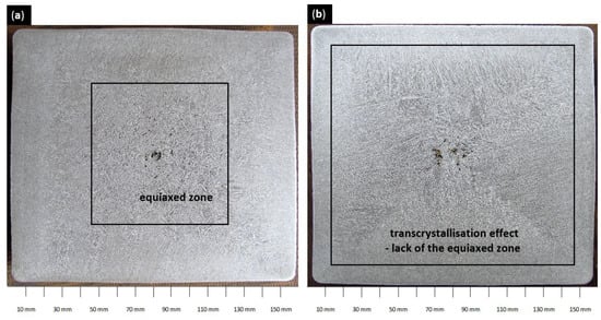 The structure of the billet presented in Figure 11a is a model structure with a clearly formed equiaxed zone. However, in Figure 11b, one can observe the so-called transcrystallisation effect, or a strong growth of the columnar zone, with a trace presence of the equiaxed zone. The conducted macrosegregation examinations in billets (examination with a spark spectrometer and a LECO analyser) directly confirmed the correlation between the billet structure quality and the carbon segregation level. For strands cast with a lower speed of 1.8 m/min, a lower segregation degree was measured, compared to the higher casting speed of 2.5 m/min (with the same amount of water fed per mass unit of cast steel). In the conducted examinations, the selected samples were etched to reveal their macrostructures. The mentioned examinations involved the following stages: