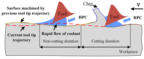 When in the cutting duration, the cooling conditions are similar to those in the CM process. When an HPC jet is applied to the flank, high-pressure fluid can penetrate the workpiece-tool interface [31], providing better cooling and lubrication of the tool. In addition, it can also work as cushions to reduce friction between tool flank and the machined surface of workpiece. During high-speed milling, the largest heat source is often located near the cutting edge while the chips and the workpiece tightly contact the rake face of the tool respectively, as shown in the cutting duration in Figure 4. Since the coolant can’t reach the cutting edge, the cutting heat will quickly accumulate and generate a high cutting temperature. This is the main reason why CM method still suffers from rapid tool wear even under HPC technique.