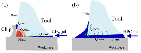 Heat transmission on the tool: (a) conventional milling (CM) with HPC and (b) HRUEM with HPC in non-cutting duration.
