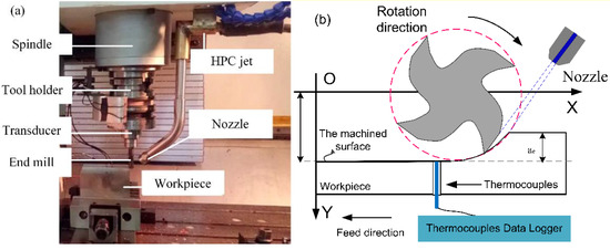 All end milling experiments were carried out with HPC on a four-axis CNC milling machine (BV100, Beijing Mechatronics Machine Tool Co., Ltd.) with a maximum spindle speed of 8000 rpm, as shown in Figure 7. Cutting speed hinders the improvement of cutting efficiency. Therefore we selected three cutting speeds for experiments and kept the feed rate per tooth, the axial depth and radial depth constant. Detailed experimental conditions are listed in Table 3. The HPC flow rate is 21 L/min and the nozzle is located approximately 20 mm from the tool tip, as shown in Figure 7a. The angle of the nozzle is carefully adjusted so that the high-pleasure coolant is injected into the cutting area, as shown in Figure 7b. To ensure the accuracy of experiments, each parameter was conducted three times, and the average result was taken as the final value.