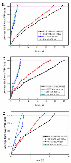 The variation of flank wear under different coolant pressures and cutting speeds in both HRUEM and CM: (a) , (b) and (c) .