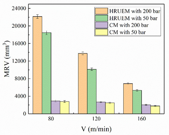 - At 200 bar HPC and 80 m/min cutting speed, the MRV of HRUEM increased by about 657% compared to that of CM. In contrast of the CM at a cutting speed of 80 m/min and 200 bar HPC, the MRV in HRUEM at the cutting speed of 160 m/min and 200 bar HPC went up by about 135% and the material removal rate (MRR) was also doubled in HRUEM. Therefore, HRUEM with HPC was an effective method for milling of titanium alloys with high efficiency.