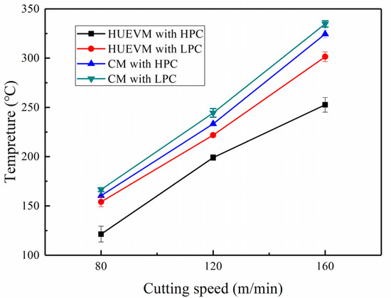 The average integral temperature over the tool-chip interface of both CM and HRUEM at different coolant pressures and cutting speeds are shown in Figure 10. Due to the difficulty in measuring cutting temperature in practice, the change trend of this temperature can represent the change of cutting temperature to some extent. We could see that the temperature rose as the cutting speed increased under all coolant pressures for both cutting methods. In CM, the highest temperature occurred at the cutting speed of 160 m/min and 50 bar HPC with the value of 334.8 °C. When 200 bar was applied to CM, the temperature was reduced to 324.5 °C. Compared with CM, when HPC was applied to HRUEM, the temperature was significantly reduced, i.e., 301.4 °C at 50 bar and 252.6 °C at 200 bar. Compared to CM with 50 bar, the reduction rate of the temperature for CM with 200 bar was about 3.8% at 80 m/min, 4.8% at 120 m/min and 3.2% at 160 m/min respectively. However, under the HPC cooling condition, the temperature reduction effect of HRUEM was significantly enhanced. When the cutting speed was 80–160 m/min with 200 bar HPC, the temperature in HRUEM was 121.4–252.6 °C. Compared to CM with 200 bar, the temperature reduction rate could be improved to a maximum value of 24.1% under the HRUEM with 200 bar at the cutting speed of 80 m/min. The significant temperature reduction in HRUEM was due to much higher heat convection efficiency between the cutting edge and coolant by the intermittent cutting mode achieved in this method, as analyzed in Section 2.3.