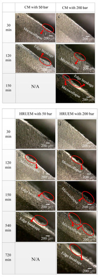 Images of the tool flank wear in CM with 50 bar are presented in Figure 11a,b. It was found that the coating quickly wore out and a microcollapse occurred, and tool flank wear gradually intensified over time until the cutting edge failure. Figure 11c–e presents the tool flank faces of the CM with 200 bar and shows slower flank wear progression of the cutting edge than the CM with 50 bar. Figure 11f–i presents the tool flank faces of HRUEM with 50 bar. During the initial cutting stage, small notch wear was observed in the flank face, then notch wear and flank wear were intensified until the tool failure mode was changed to edge breakage. Tools in HRUEM showed a much smaller flank wear compared to CM at the same cutting duration. In addition, for HRUEM method, a 200 bar coolant could lead to a slower tool wear rate than the one with 50 bar coolant. As shown in Figure 11j–n, it took about 720 min to reach the failure standard using HRUEM with 200 bar.
