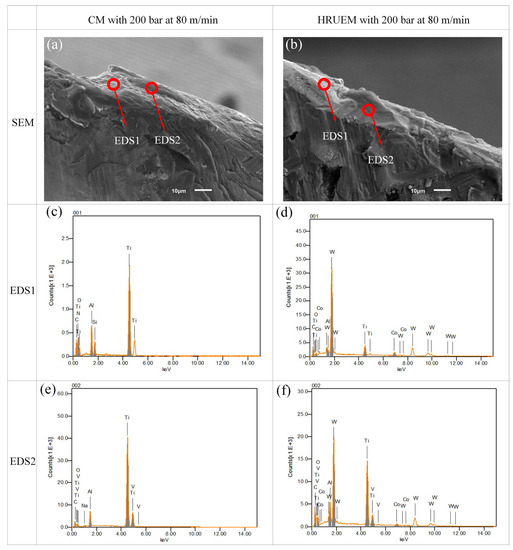 To study the tool wear mechanism in HRUEM with HPC, we took SEM micrographs of tool flank faces under various cutting conditions and conducted energy dispersive spectroscopy (EDS) analyses. As you can see in Figure 12a, a thick adhesion layer could be found on the tool flank face in CM with 200 bar, covering almost the whole wear area. Figure 12c,e indicates a very high concentration of Ti, the principle chemical element of the workpiece. The existence of the workpiece element on the whole wear face manifests indicates the presence of adhesive wear. In addition, considerable concentration of O was found in Figure 12c,e, providing the possibility of the presence of oxidation wear in this case.