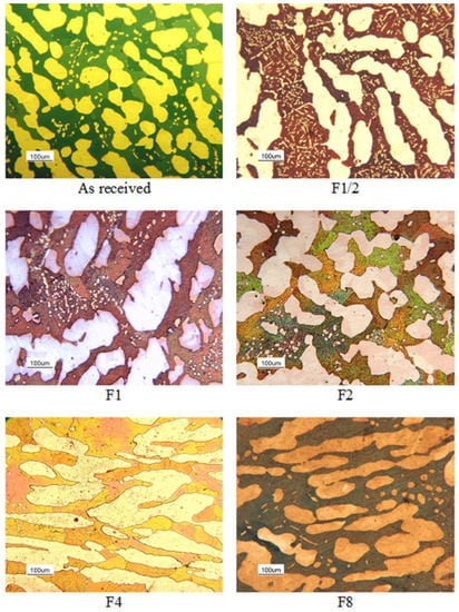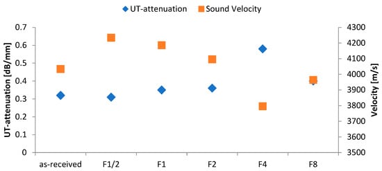 The ferritic matrix and the austenitic islands, having a dimension in the order of 100 μm, meet the condition of Rayleigh scattering. On the other hand, the contribution of the γ-precipitates on sound attenuation, caused by grain boundaries scattering, is appreciable in the as-received, F2, and F8 samples, while in the other conditions, it is negligible [3,12].