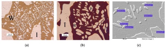 Microstrcture of F1/2 (a), F1 (b), and scanning electron microscopy (SEM) caption on sample F1/2 for EDS analyses (c). Particulars of the DSS microstructure with varying austenite shapes, it is possible to distinguish the following: austenitic islands (I), Widmanstetten arms (W), and (b) polygonal (P) and round-shape grains (R).