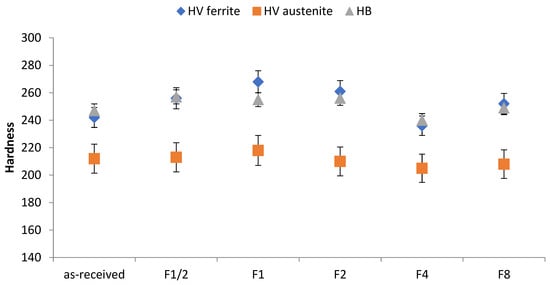 Figure 4 shows the hardness measurements carried out on each specimen. It is possible to note that the values remain quite constant. The HV was measured in each phase, but only taking into consideration the austenitic islands.