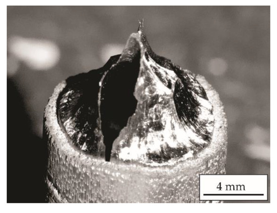For trial 3, as shown in Table 1, three changes were made: To improve the chemical composition, high purity primary-production metals were used, and a grade 2-titanium starter bar tip was mounted instead of a steel tip. The casting speed was reduced to decrease the temperature in the mould, an, therewith, the probability of the reaction with the melt. The start was smooth. The strand surface was a bit rougher than in the previous trials. The appearance of the longitudinal section was practically identical to the longitudinal section of strand 2—as expected, as the only difference compared to trial 2 was a longer stop between the strokes (Table 1). However, the secondary witness marks were more distinguished (Figure 1c). Such a surface is not desirable, but it may still be acceptable, as the surface layer of continuously cast strands is often removed (peeled off) prior to further processing in order to obtain a flawless surface without defects. The cause for distinguished secondary witness marks was incomplete remelting of the edges of the static and dynamic skin due to the lower average temperature in the upper part of the mould. But despite the temperature being lower, it was still too high to prevent the strand sticking to the mould completely. Figure 4 shows a copper particle sticking to the strand just below the primary witness mark. The location of the copper-particle indicates that it was torn off the mould-wall in the uppermost part of the mould, just below the ceramic nozzle, where the mould-material is exposed to the highest temperatures.