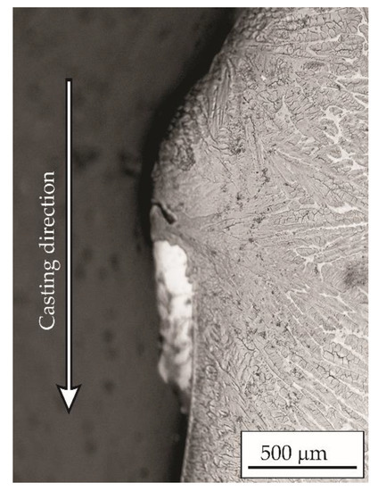 The temperature of the upper part of the mould should be reduced further for trial 4. This can be achieved most effectively by decreasing either the casting speed or the temperature of the melt. However, in industrial production, high productivity is desired, while the melt temperature was, in the previous trials, only 110 °C above the melting point. Hence, the melt-temperature and other casting parameters remained the same as in trial 3, but, instead of zirconia, the nozzle was made of silicon nitride. The thermal conductivity of silicon nitride is, at high temperatures, more than three times higher than that of zirconia [45]. This means that, in trial 4, more heat was dissipated from the melt into the cooler through the nozzle, and, consequently, the temperature of the melt entering the mould was lower. The surface of strand 4 was rough and uneven (Figure 1d). The microscopic investigation of the longitudinal sections revealed that, during the resting period, the solidification front intruded more than 1 mm deep into the nozzle (Figure 5a). Upon the next stroke, the solid skin moved downwards, from the nozzle into the mould, which, as usual, had a slightly larger diameter than the nozzle, and the melt started to flow into the gap between the mould and the solid skin which formed in the nozzle. However, it solidified before the gap was filled completely. Consequently, the primary witness marks are deep, wide and of irregular shape. In addition, as can be observed in Figure 5a, the melt in the gap could not remelt the skin which formed in the nozzle. Additionally, at the secondary witness marks, the edges of the static and dynamic skin were not remelted, and formed a bond strong enough to withstand the first stroke after their formation. Therefore, cracks formed at a large number of secondary witness marks (Figure 5b). Due to the cracks at the witness marks, the strand soon broke and the trial was interrupted.