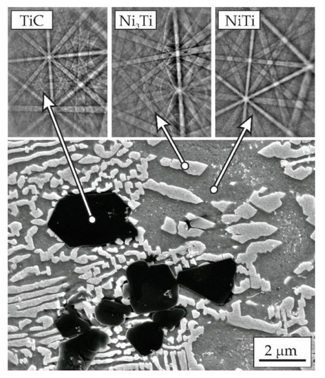 Microstructure of strand 2: SEM image. Three phases were observed. Strongly prevailing cubic NiTi (light grey), hexagonal Ni3Ti (almost white), and some small groups of TiC-particles (dark, almost black). Kikuchi patterns of these three phases, obtained by the EBSD system, are presented on the top.