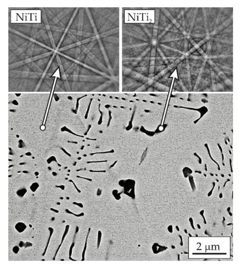 Microstructure of strand 3. SEM image. Two phases were observed. Strongly prevailing cubic NiTi (grey), cubic NiTi2 (dark, almost black). Kikuchi patterns of NiTi and NiTi2, obtained by the EBSD system, are presented on the top.